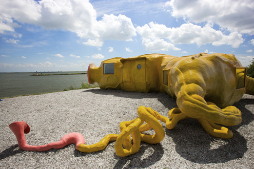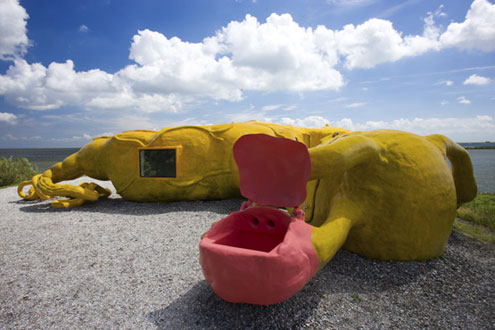 For the Zuiderzeemuseum in Enkhuizen Atelier Van Lieshout made Huize Organus. This multi-functional unit is placed on a small dyke in the museumpark. The unit consists of several elements of which the large part houses the complete digestive system from tongue to rectum. The largest part of this ‘microworld’ is blown up to massive proportion so that people can enter. Grown out of this sculpture is the clip-on compost toilet. On the other side the female reproductive organs are attached. In this Wombhouse you will find a small bedroom, where one can sleep in the most save place one can imagine on earth, the womb.