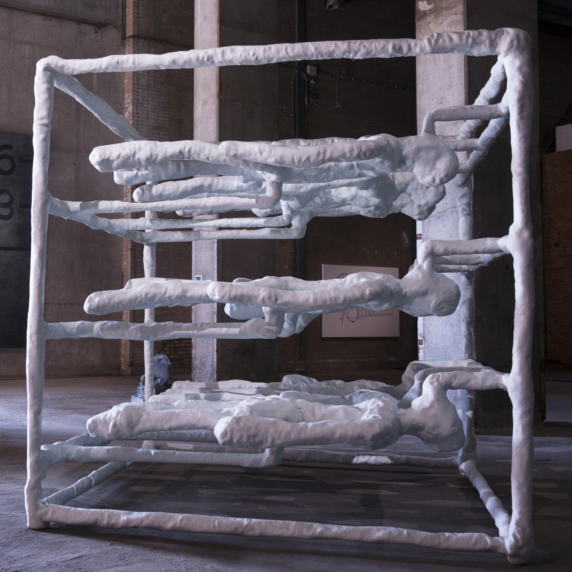 Humans are nothing but biogas producers in the large-scale installation The Technocrat. The Cube embodies its most rigorous form of industrially farming humans. Bodies are fixed to frames, food and anaesthetic alcohol are administered while tubes attached to their anuses suck up the excrement. These units lend themselves to efficient stacking.