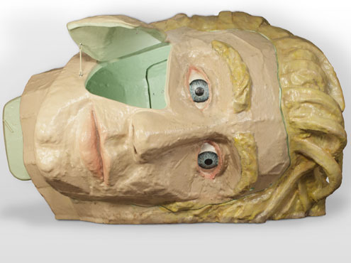 This sculpture group has three heads, which are hollow and can be used in different ways. The male head Hermann is a typical blue eyed blond, the female Claudia has dark hair and brown eyes. Tom, the third head, is a dark-faced man, standing straight on his neck. The three of them together reflect on the diversity of humanity in a very special way. Keep an open mind, whatever its size.